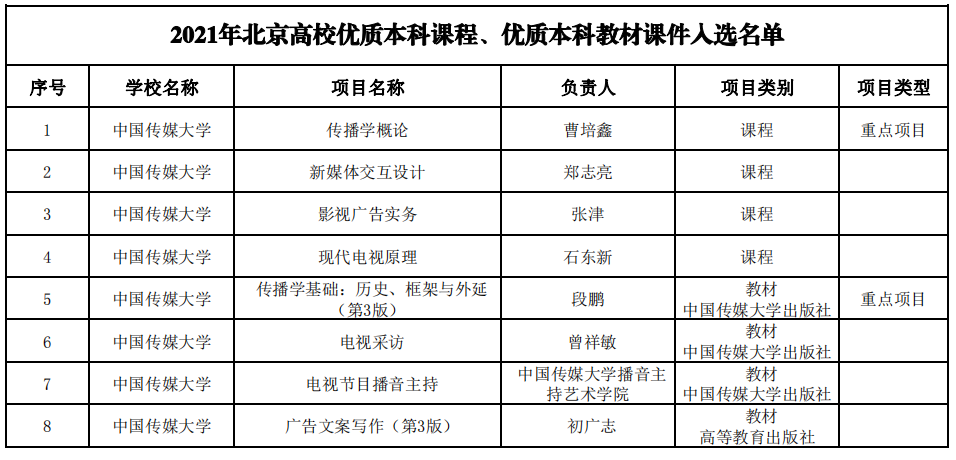 (通讯员 薛玉莲)日前,北京市教育委员会公布了2021年“优质本科课程”和“优质本科教材课件”遴选结果以及2021年“北京高校优秀本科育人团队”和“北京高校优秀教学管理人员”评选结果,我校推荐的优秀本科育人团队、优秀教学管理人员、4门优质本科课程、4部优质教材课件项目全部入选。其中,《传播学概论》入选优质本科课程重点项目,《 传播学基础:历史、框架与外延(第3版)》入选优质本科教材课件重点项目。