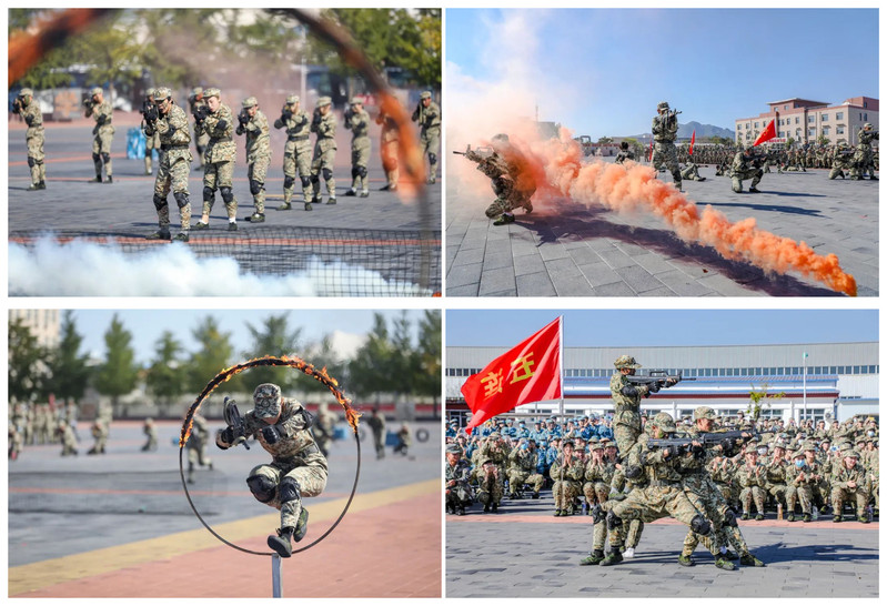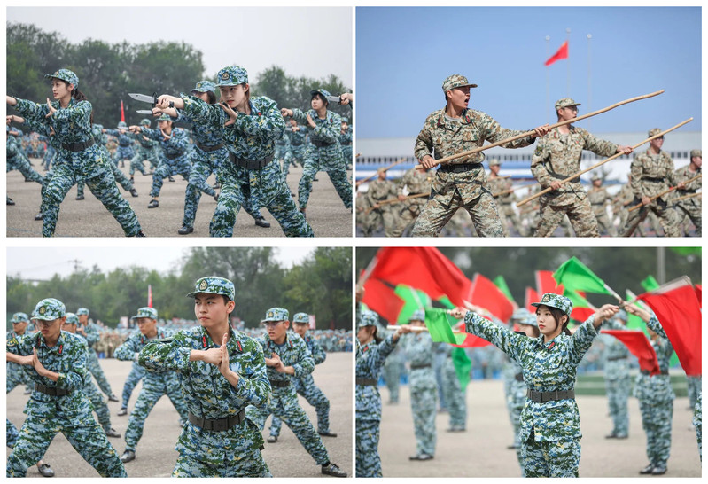 在军训成果汇报表演中,两个基地的参训学生分别表演了匕首操、刺杀操、军体拳、擒敌拳、格斗术、长棍术、连队列、旗语展示以及战术综合演练。汇报表演在校歌《校园里有一排年轻的白杨》合唱中圆满落下帷幕。