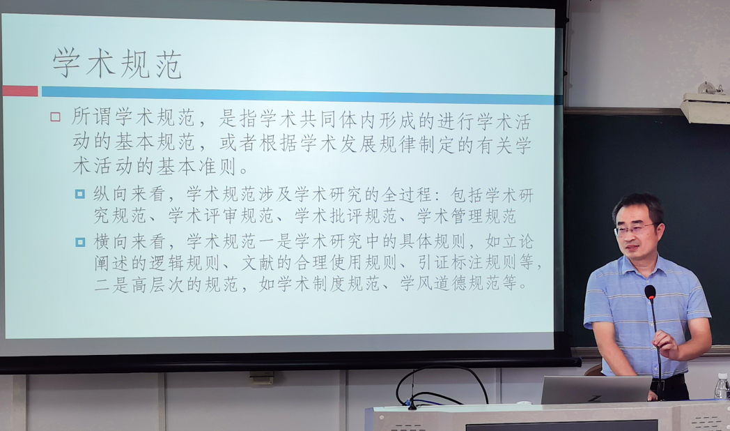 科学研究处副处长张国涛为新晋导师们详细介绍了传媒学术研究中的规范问题,涵盖内容规范、形式规范、道德规范、伦理规范四个方面,尤其对学术不端问题进行了强调和预警,帮助新晋导师认清学术研究中应注意的种种问题。