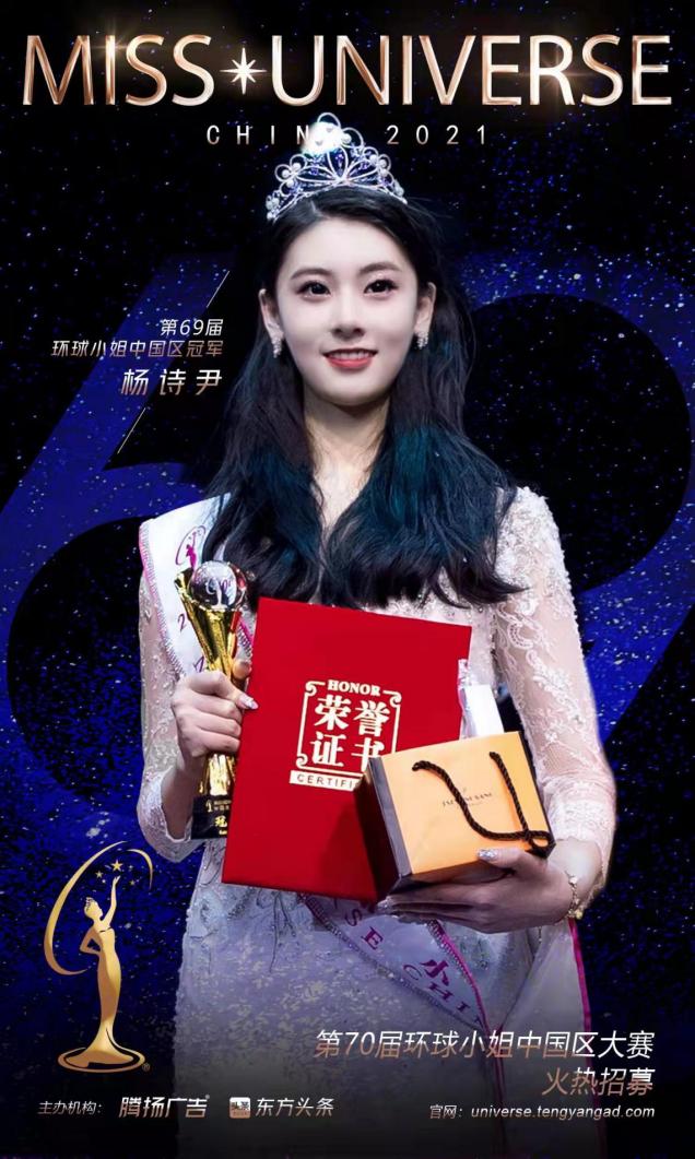 大学生活中,杨诗尹努力学习,不断提高文化知识及专业素养,锻炼自己的表演能力及才艺水平。偶然的机会,杨诗尹在网上看到环球小姐中国区大赛选拔信息,便决定挑战一下自己。经过几个月的训练与努力,杨诗尹凭借出色的表现获得北京赛区冠军,并在全国总决赛中以压倒性的优势摘得第69届环球小姐中国区冠军。
