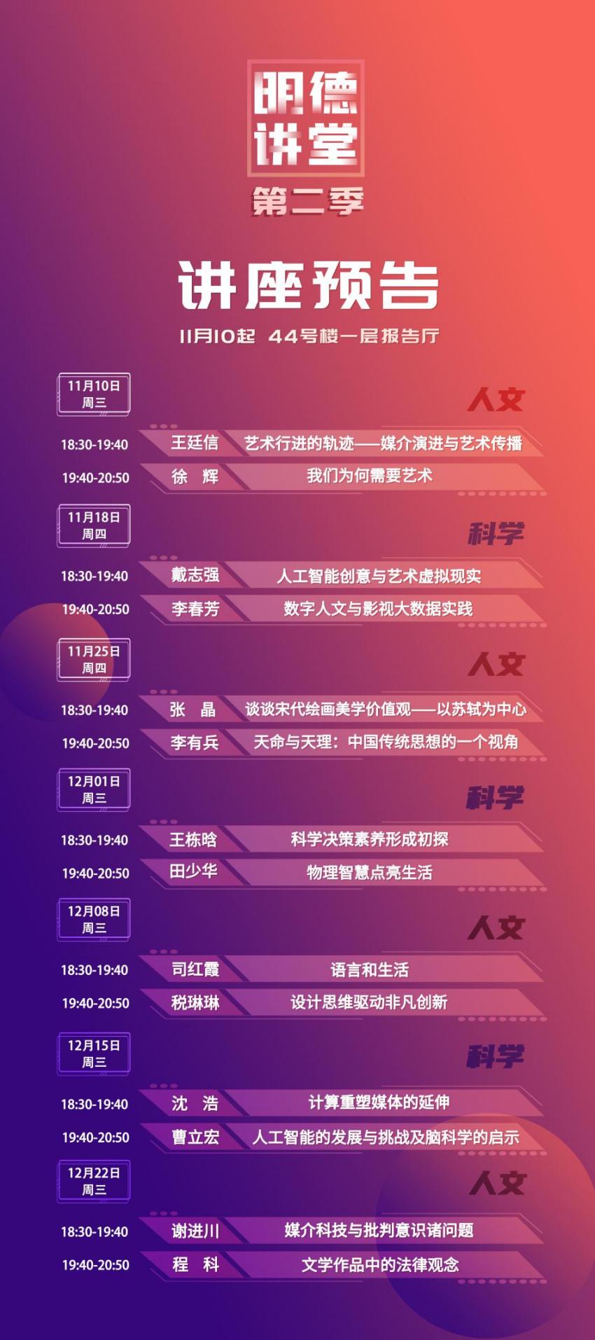 “明德讲堂”(第二季)于11月10日至12月22日间举行,历时7周,14位教师将从不同学科领域和研究视角出发,带来14场专题讲座。这些课程资源也将陆续向广大同学开放,引导大家深入思考,主动学习。