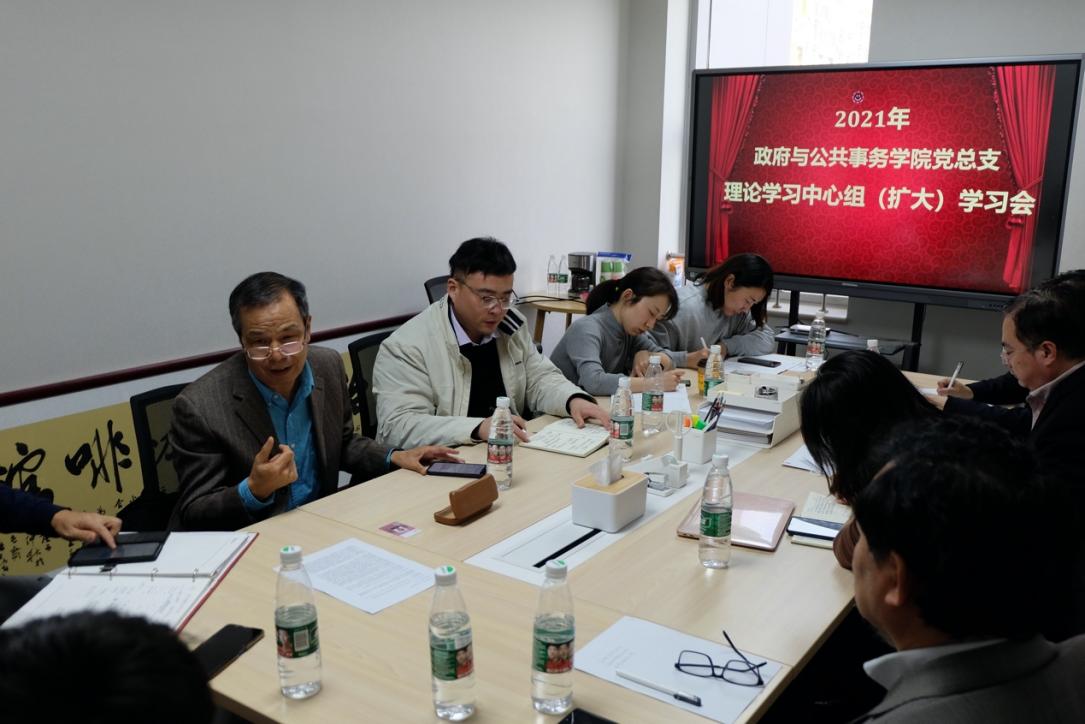 (通讯员 孙珺)11月17日下午,政府与公共事务学院党总支理论学习中心组召开(扩大)学习会,专题学习十九届六中全会精神,学习会由荆学民教授领学。