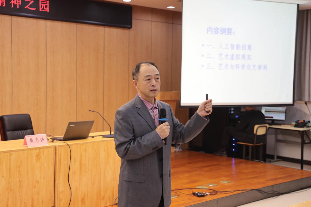 戴志强教授讲座的题目为《人工智能创意与艺术虚拟现实》。他从“应该从哪些方面去理解人工智能技术?如何认识人工智能创意的创新实践?最新兴起的‘元宇宙’是怎样的概念?如何对艺术虚拟现实进行科学的分析评价?如何认识新文科?”几方面问题入手,从艺术表现与科学认知的视角,与同学们分享了自己的思考。戴志强教授提出,随着当今时代科技革命的发展,人们越来越关注人工智能技术、虚拟现实技术、5G技术对人类生活的影响,关注人工智能创意的发展和艺术虚拟现实的发展。人工智能的根本在于认知智能,而非行为模仿。他分析了人工智能五个未来领域,分别是大数据智能、跨媒体智能、群体智能、人机混合智能、以及自主智能系统。戴志强教授提出,人工智能不一定像脑一样去思考,不一定像人一样去计算,而是可能以超越人的一种模式去思考、去计算,“这是未来的人工智能”。