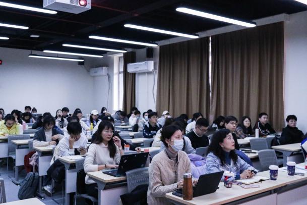 李彬副教授简要介绍学校在传媒技术领域的优势特色和学院的学科基础,从应急广播、互联网视听传播、广电5G等技术方面的优势入手,为同学们讲述了在党的坚强领导和国家的高度重视下,广播电视技术的创新与发展。
