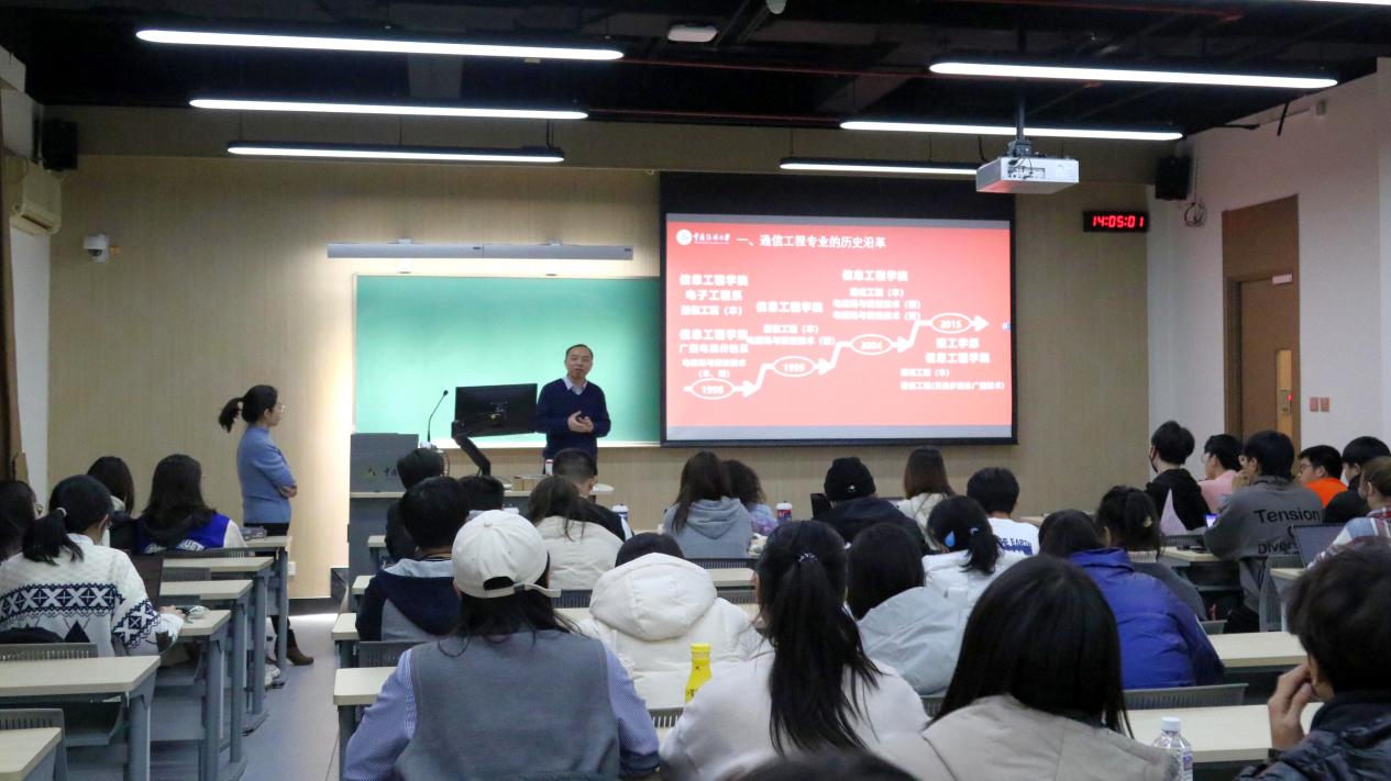 王晖副校长重点为新生讲述了通信工程专业的发展史,以及1954年至今信息与通信工程学院的发展与变化。他还特别介绍了学院的育人成果,1978级播控专业的丁文华院士、1998级电磁场与微波技术专业的中国载人航天任务微波雷达主任设计师蒋清富等都是学院培养出来的优秀毕业生,广大新生应以他们为榜样努力奋斗,报效祖国。