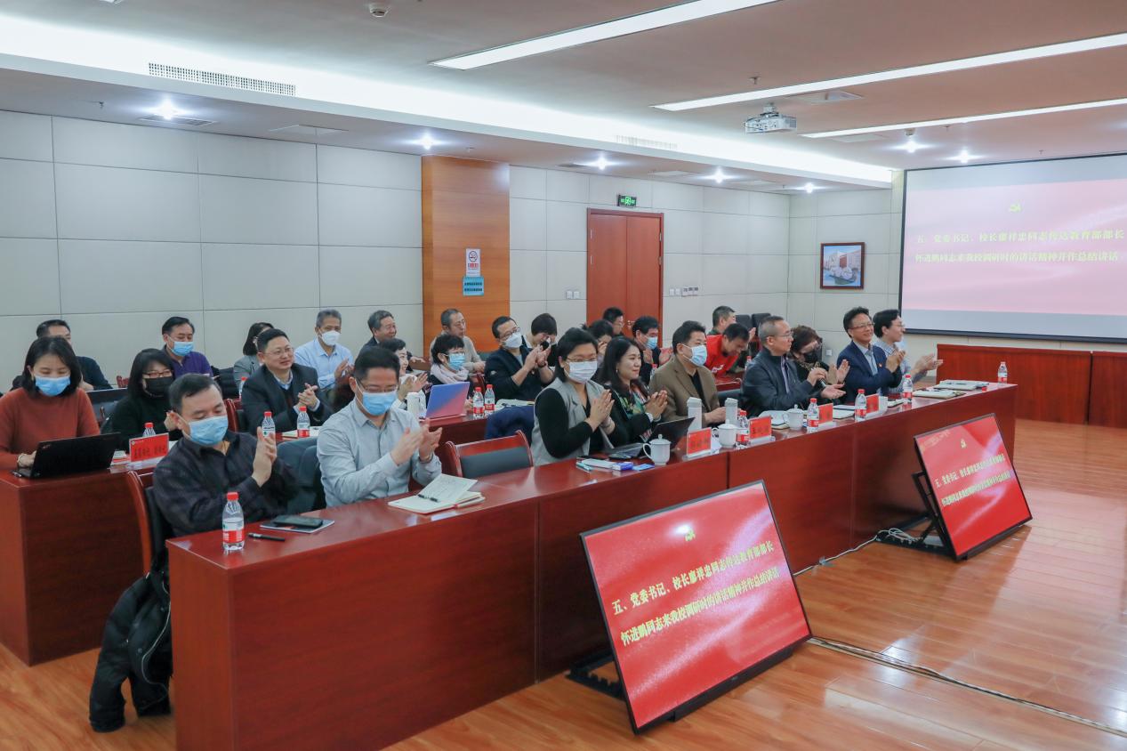 廖书记指出,怀进鹏部长、田学军副部长百忙之中来到学校考察调研,听取汇报,充分肯定学校办学特色、改革举措和育人成果,要求学校发扬“系统治理、创新驱动”精神品质,进一步强化优势特色,把立德树人做得更扎实,把传媒事业做得更辉煌。怀部长的讲话为学校高质量发展指出了努力方向,我们要按照教育部党组和怀部长要求,从政治上看教育、从民生上抓教育、从规律上办教育,为党育人、为国育才,推动学校事业高质量发展。