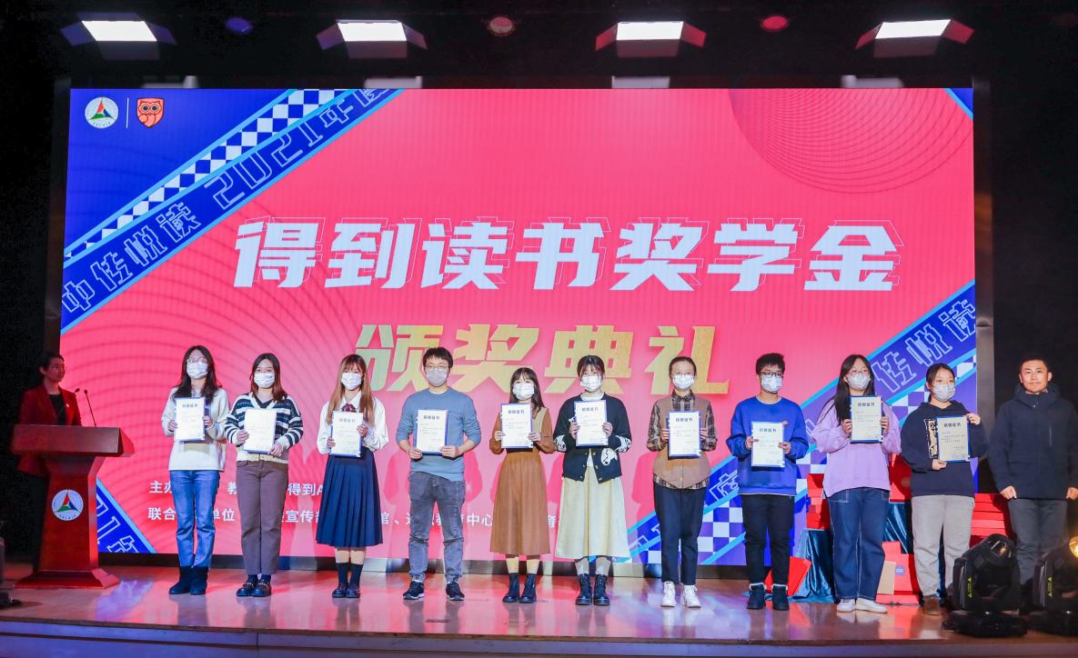 校长助理杨懿、图书馆馆长龙小农、学生工作处副处长魏峰、得到人力资源副总裁盛莹依次上台为40位2021-2022学年“得到读书奖学金”获奖学生颁奖,并合影留念。