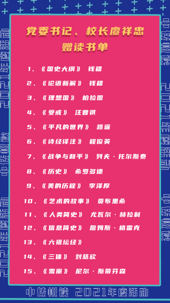 2020年2月,我校与得到文化传播有限公司签订协议,设立中国传媒大学“得到读书奖学金”,每年评选出40位“爱读书、会读书、读好书”的本科生同学,为其颁发荣誉证书和奖学金。今年是“得到读书奖学金”设立的第二年,来自16个本科学院的近600位同学提交了读书笔记,展现了我校学生极大的阅读热情与思考领悟能力;中传悦读·2021年度活动由中国传媒大学教务处协力党委宣传部、图书馆、校传媒教育基金会联合举办,鼓励同学们以书为友、以文为伴,将“悦”读理念内化于心、外化于行。设立“得到读书奖学金”、举办“中传悦读”系列活动进一步推进了校园文化建设,是全面提升学生文化素养,落地、落实新文科、新工科建设的重要举措。