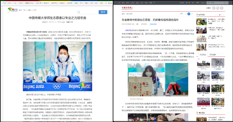 在詹新惠老师、柳帆老师指导下,多位学生的新闻评论作品在人民网发表。作品聚焦“绿色办奥”“竞技比赛背后的友谊”“科技冬奥”“齐广璞夺冠”“场下运动员服务奥运”等主题,论点清晰明确,论据科学充分,论证过程合理严密,展现了新闻学子的专业水准。《竞技拼博背后的友谊同样打动人心》《坚毅之心映风雪,“无冕之王”终夺冠》《以另一种身份“上场”,同样值得掌声》被全网转发,2021级新闻学本科班李孟熹同学的作品《竞技拼博背后的友谊同样打动人心》更是在“今日头条”热榜置顶。中国新闻网、中国青年网等媒体分别对新闻学院师生志愿者和参与冬奥的校友进行了报道。
