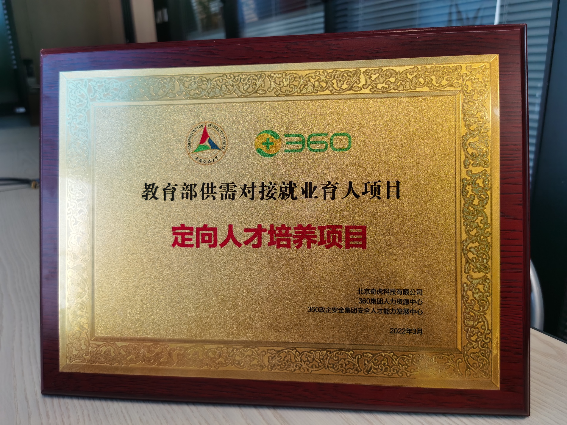 会上,360政企安全集团启动了360数字安全人才校园项目暨2022全球春季招聘项目启动仪式,并对2022年项目首批立项院校进行授牌。我校计算机与网络空间安全学院相关负责人代表学校接受了授牌。