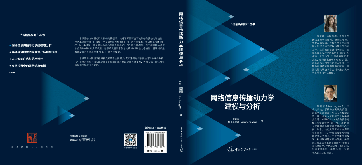 此外,殷复莲教授与加拿大约克大学终身教授、工业和应用数学研究领域首席科学家Jianhong Wu教授合著了国内第一部网络信息传播动力学领域的专著《网络信息传播动力学建模与分析》,继承和发展了传染病动力理论,重点在于对建模思想、动力学理论和信息传播规律的解释,并涉及常微分方程构建、参数估计、参数敏感性分析以及可视化等技术。专著对应用于不同场景下的信息传播动力学模型进行了构建,能够实现舆情早期预测功能,可以为政府等相关部门进行舆情干预与引导提供有力的数据支持,同时也能为行业及领域开展更深入的研究提供可拓展的框架。
