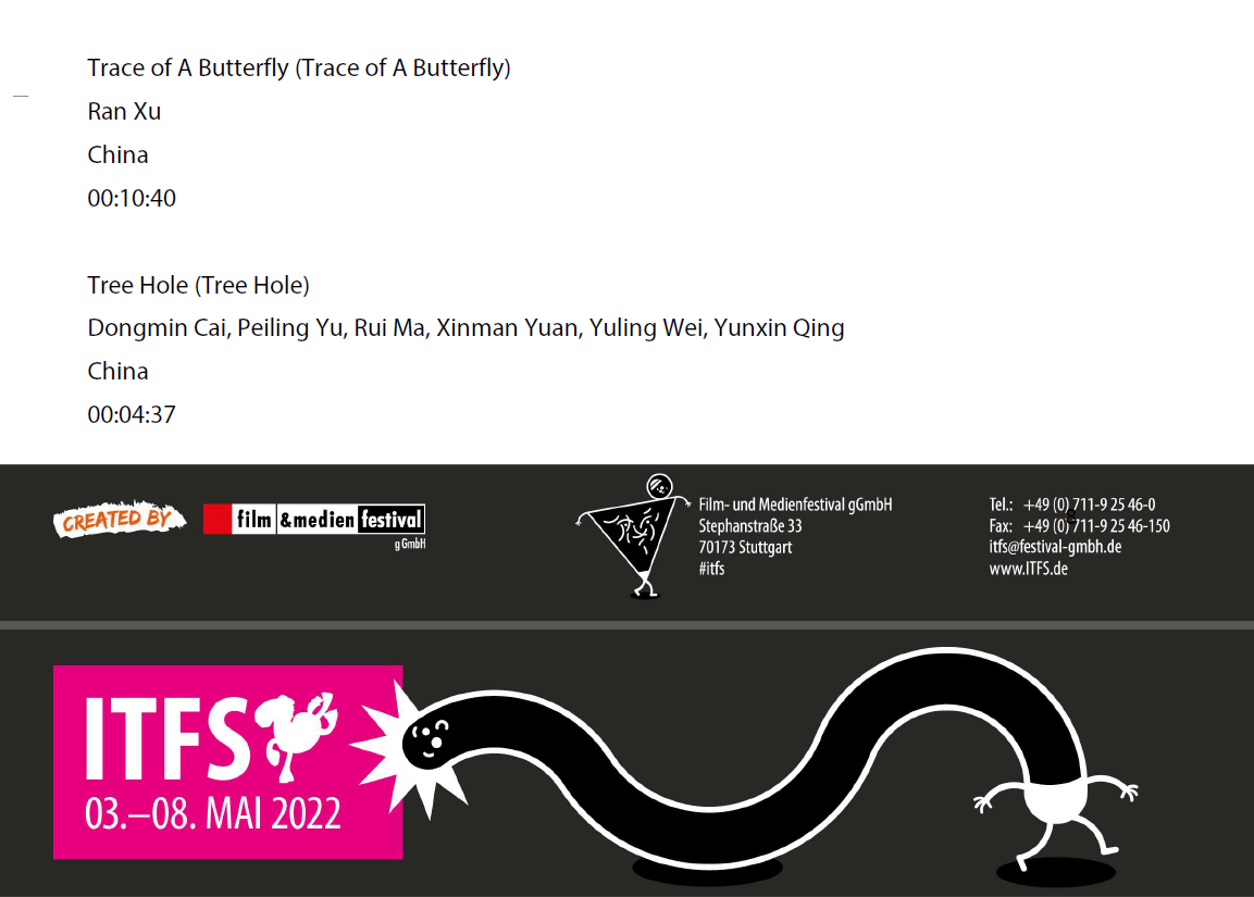 斯图加特国际动画节创办于1982年,是世界上最重要的动画节之一,也是具有奥斯卡奖资格认证的顶级赛事,在欧洲的同类节展中占有举足轻重的地位。2022年,动画节将于5月3日至8日在德国西南部城市斯图加特举办,届时《蝴蝶飞落的痕迹》与《树洞》将以线上与线下相结合的方式进行展映。