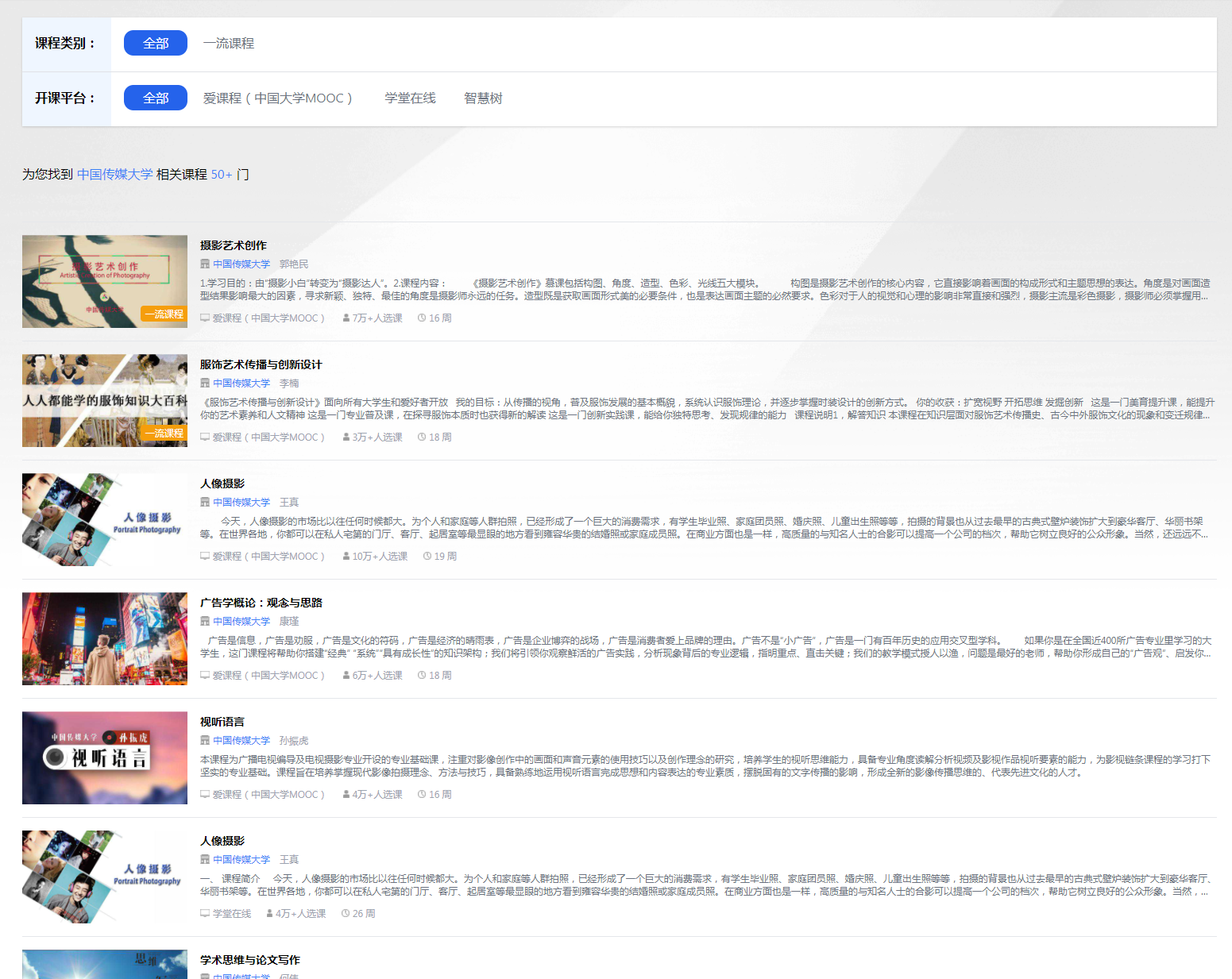 此次我校入选的61门课程中包括中文课程50门,英文课程11门。其中有《摄影艺术创作》《服饰艺术传播与创新设计》等首批国家级线上一流课,也有依托我校学科特色和专业特色的校级优质示范课,充分体现了我校近年来在线开放课程建设取得的成效。