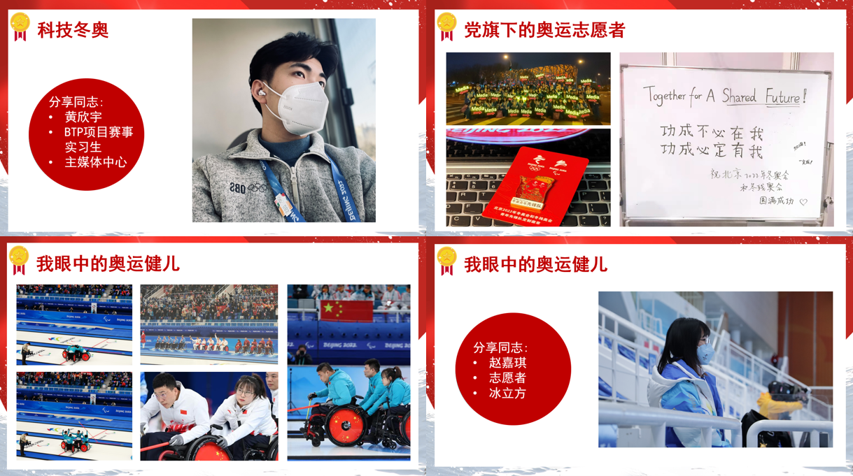 通信工程学生党支部书记黄欣宇同学带领支部党员们结合自身冬奥服务保障工作,分享了学习体会。赛事期间,他们分别担任了志愿者、城市志愿者、BTP项目赛事转播实习生、央视场记实习生,为2022年北京冬奥会、冬残奥会贡献青春力量。黄欣宇同学分享了自己作为BTP项目赛事转播实习生在主媒体中心的工作经历,他表示科技冬奥是本次冬奥会鲜明的特色,不仅彰显了我国的科技力量,也体现了我国绿色办奥的理念。赵嘉琪同学谈到,她在国家游泳中心担任志愿者,全程服务冬残奥会轮椅冰壶的比赛任务,她在这个过程中深刻感受到了冰雪健儿的拼搏精神,也立志要以中国冰雪健儿为榜样,坚定理想、刻苦学习,为实现梦想而不断努力,为报效祖国而不懈奋斗。