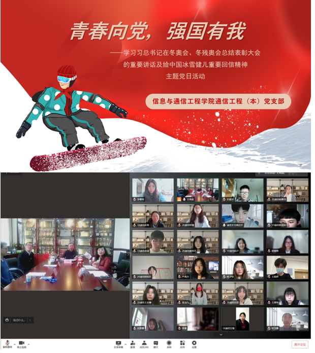 信息与通信工程学院党委书记李增瑞主持党日活动。学院党委副书记钟丹丹、演艺工程技术系教工党支部书记蒋玉暕、学生工作办公室副主任王雨晨,通信工程学生党支部的全体学生党员、入党积极分子等60人通过线上线下相结合的方式参加了党日活动。