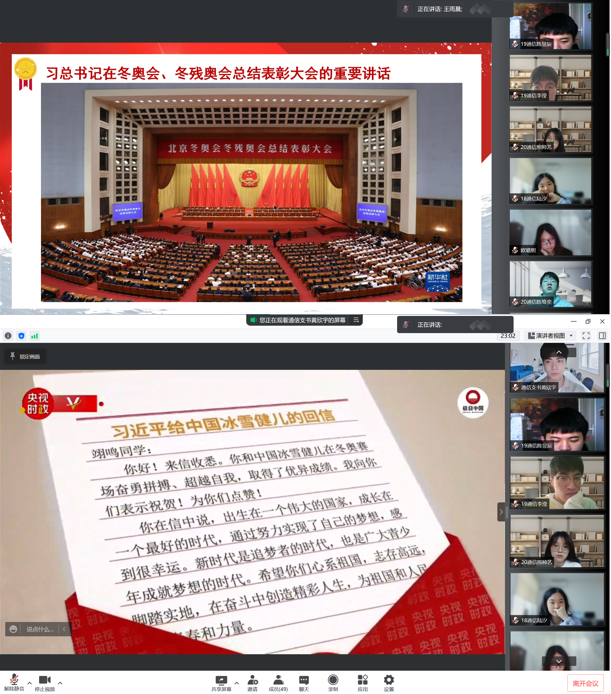 党员师生集体观看了4月8日上午习近平总书记在北京冬奥会、冬残奥会总结表彰大会的重要讲话视频,再次学习了2月24日习近平总书记给中国冰雪健儿代表中国单板滑雪运动员苏翊鸣的回信。