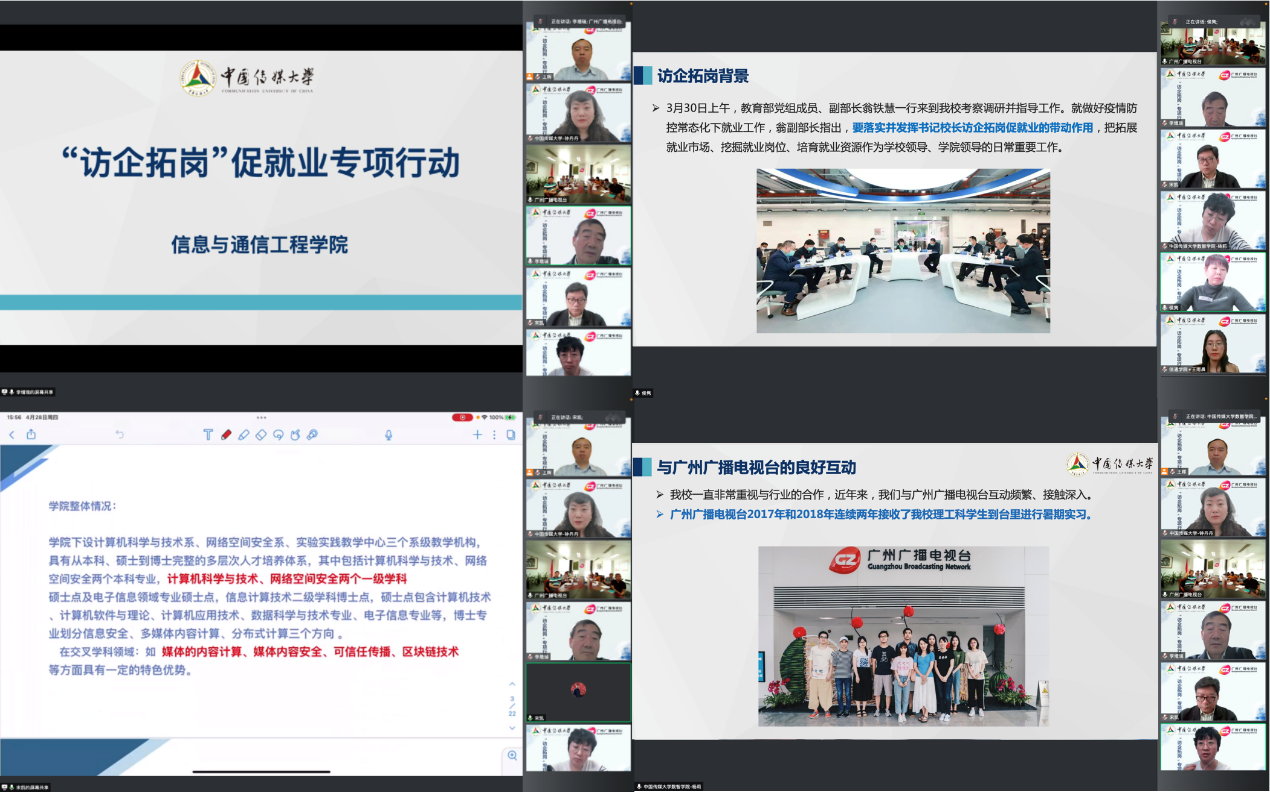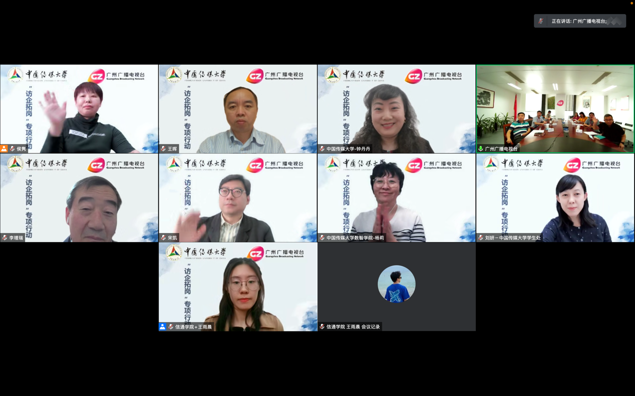 信息与通信工程学院党委书记李增瑞、媒体融合与传播国家重点实验室党委书记侯隽、计算机与网络空间安全学院党委副书记宋凯、数据科学与智能媒体学院党总支副书记杨莉分别介绍了学院人才培养和就业情况。学生工作部副部长刘妍对学校整体就业情况做了介绍,希望今后与广州台联合举办招聘宣讲会,通过“线上+线下”的招聘宣讲活动形式,搭建京粤两地人才企业线上交流互动平台。