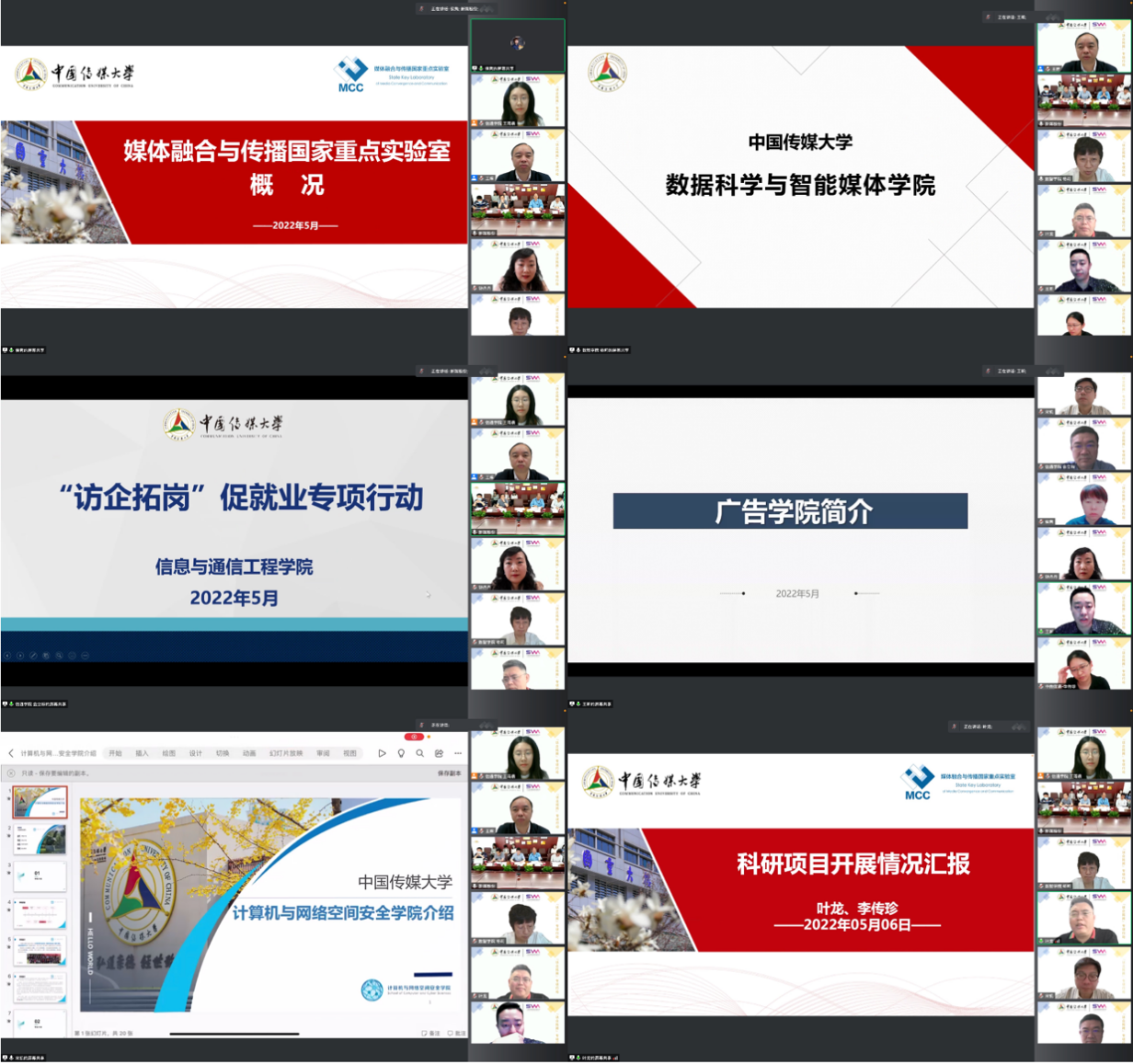 媒体融合与传播国家重点实验室党委书记侯隽、信息与通信工程学院副院长金立标、计算机与网络空间安全学院党委副书记宋凯、数据科学与智能媒体学院党总支副书记杨莉、广告学院副院长王昕分别介绍了各学院人才培养和毕业生就业情况。数据科学与智能媒体学院副院长叶龙、信息与通信工程学院数字媒体技术系副教授李传珍介绍了媒体融合与传播国家重点实验室的重点科研项目及开展情况。