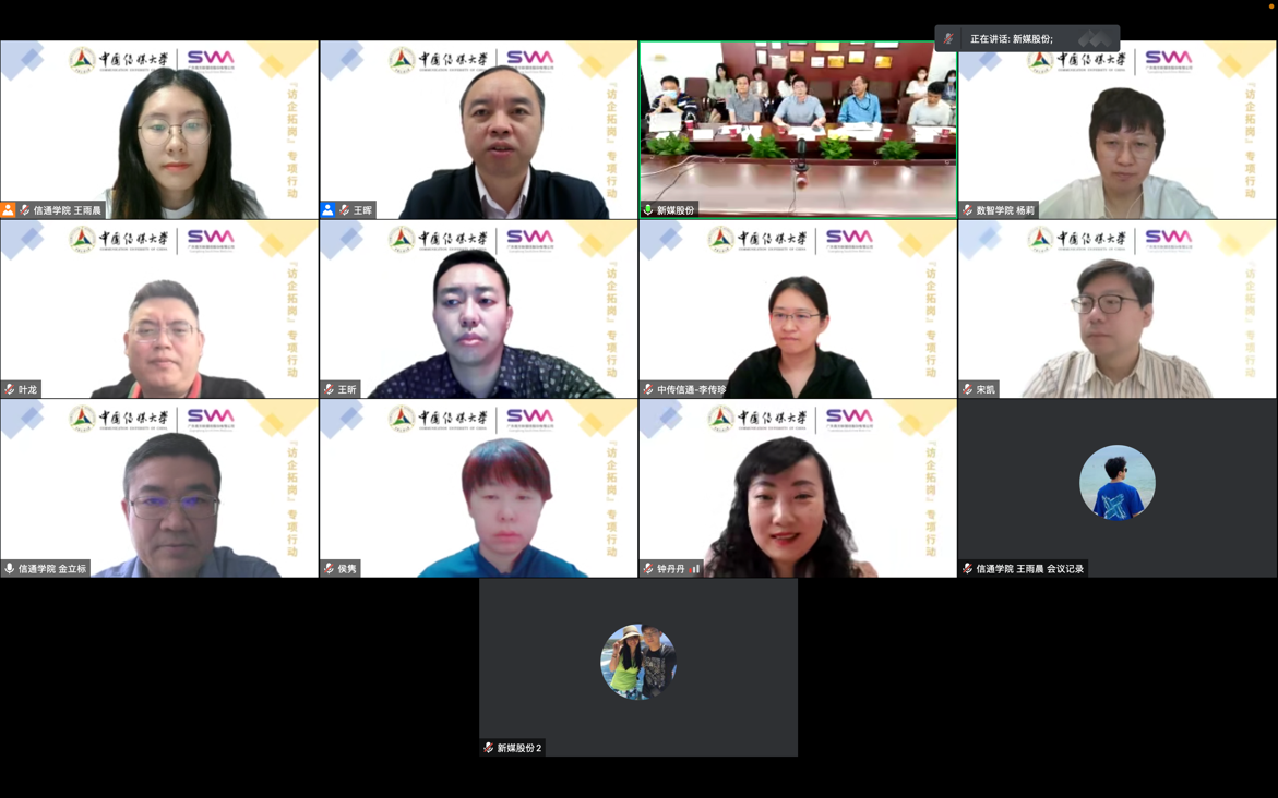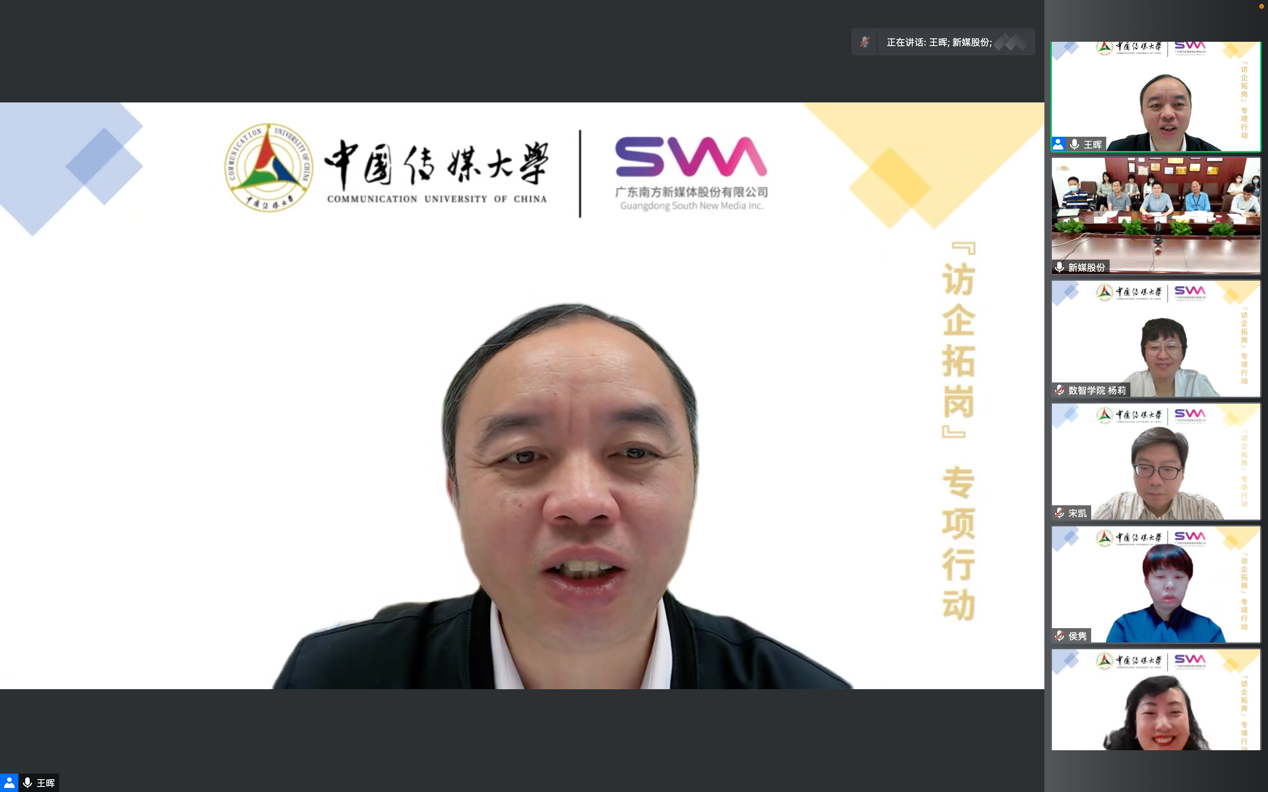 (通讯员 王雨晨 邸国桐)为贯彻落实教育部全国高校书记校长访企拓岗促就业专项行动部署,深化校企合作、供需对接,全力促进高校毕业生更加充分更高质量就业,5月6日上午,王晖副校长带队“云走访”广东南方新媒体股份有限公司,在线开展“访企拓岗促就业”校企交流会。会议由信息与通信工程学院党委副书记钟丹丹主持。