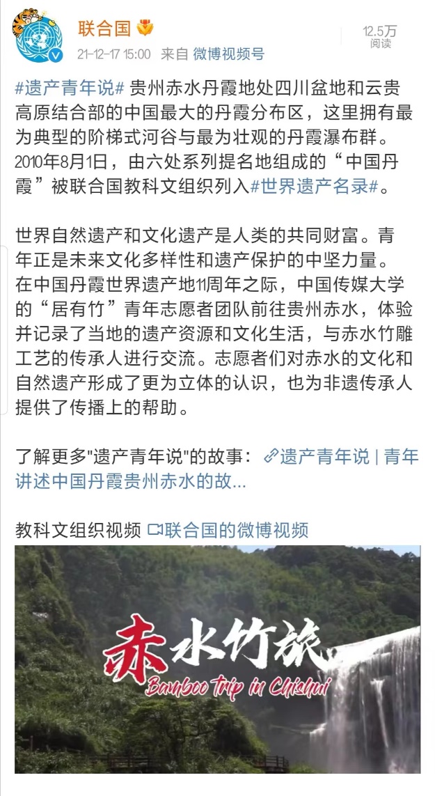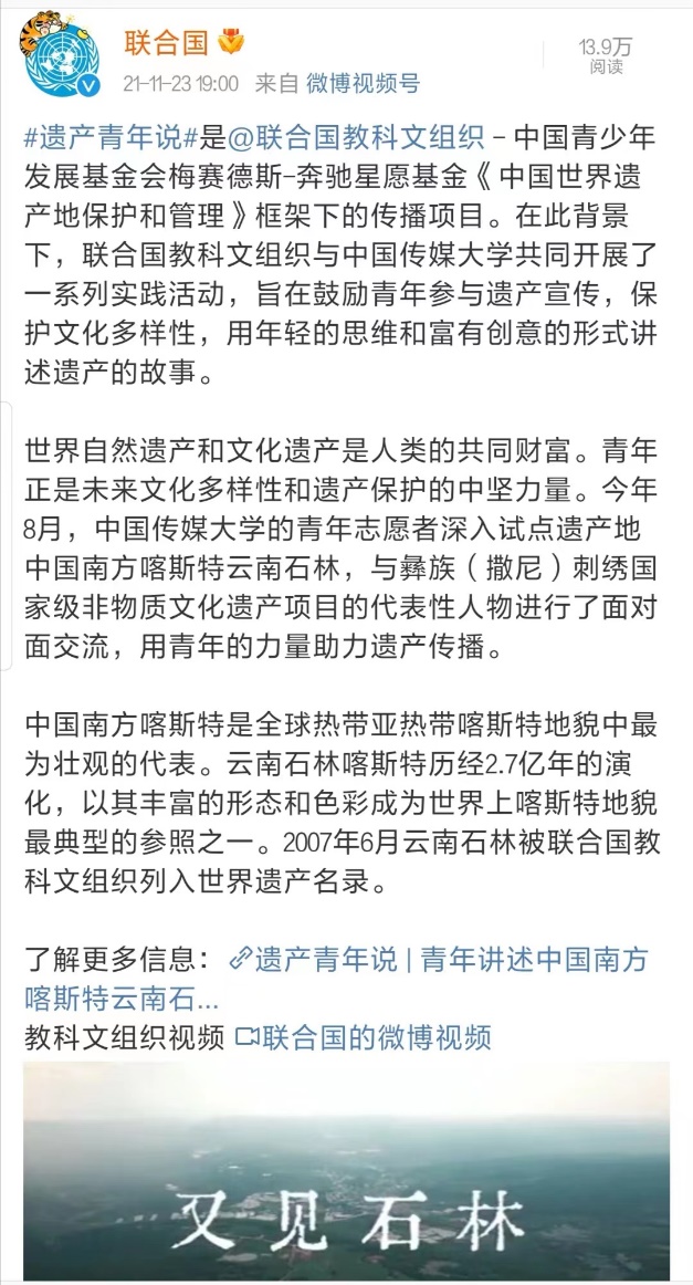 近两年来,中国传媒大学文化产业管理学院非遗传播研究中心在联合国教科文组织驻华代表处的指导下,开展了一系列遗产传播相关科研和实践,共同发起了“遗产青年说”线上线下传播活动。我校师生在云南石林、贵州赤水等地开展的“遗产青年说”活动得到了联合国官方微博的报道。
