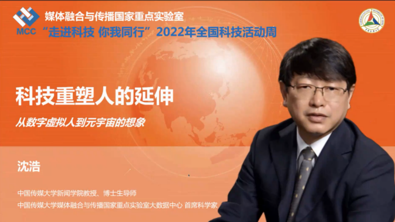 “科技重塑人的延伸——从虚拟数字人到元宇宙的想象”主题讲座由国重实验室高级研究员、媒体大数据中心首席科学家沈浩教授主讲。他从“什么是媒介?”出发,结合麦克卢汉所著《理解媒介》一书中“媒介是人身体的延伸”等观点,通过生动有趣的案例演示,推出“科技重塑人的延伸”主题,解释了数字虚拟人和元宇宙的形态与发展趋势,展示了聚合科技的发展与变革在智能媒体领域的应用。沈浩教授告诉大家,媒体融合创新不断推进社会的数字化变革,大数据与人工智能让我们与世界互动的方式随之改变,科技赋能媒体不仅仅是一种技术,更是人的认知延伸。