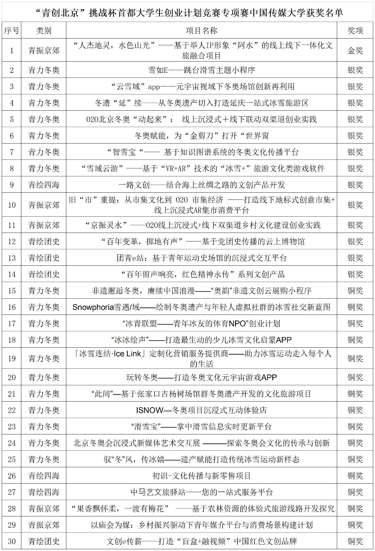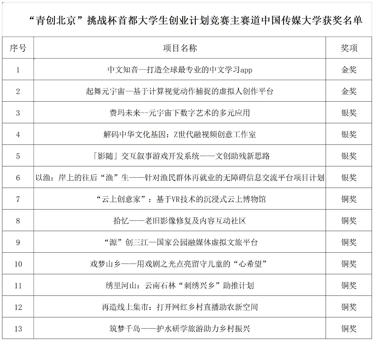 在本届“青创北京”挑战杯大学生创业计划竞赛中,中国传媒大学各参赛团队坚持协同创新、敢于亮剑、攻坚克难,用实际行动展示了中传学子严谨扎实的创新实践能力和高度的社会责任感。