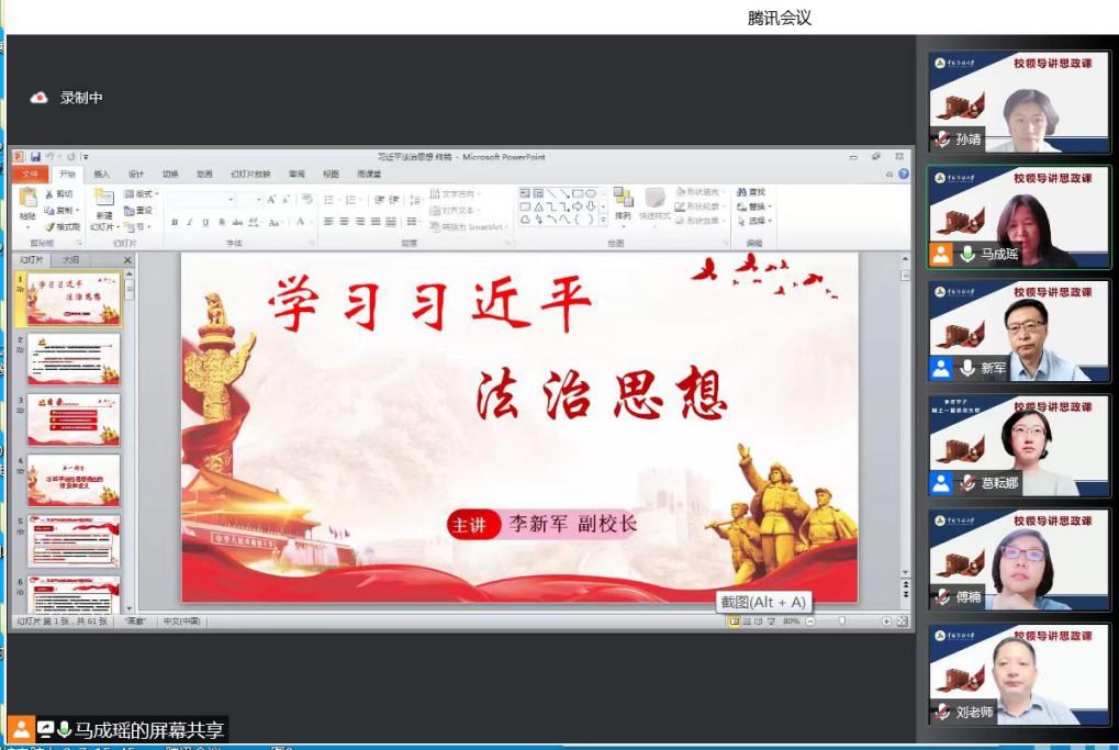 (通讯员 孙靖)6月7日上午,李新军副校长走进本科生《毛泽东思想和中国特色社会主义理论体系概论》课堂,讲授“学习习近平法治思想”云端思政课,全校13个教学班400余名本科生共同在线聆听。这是李新军副校长本学期第二次为本科生讲授思政课,也是本学期规模最大的《毛泽东思想和中国特色社会主义理论体系概论》课。
