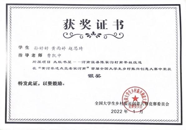 (通讯员 武瑶)日前,由中国城市科学研究会、河南省文化和旅游厅、河南省教育厅、浙江省教育厅、浙江省文化和旅游厅主办的首届全国大学生乡村振兴创意大赛获奖名单公布。由我校戏剧影视学院环境设计系曹凯中老师指导的多名学生在大赛“黄河之村”非遗赋能空间赛道中脱颖而出,共获得金奖1项、银奖2项。