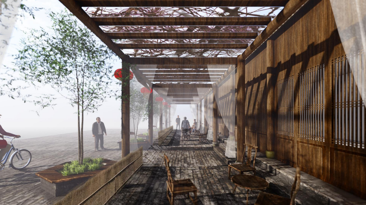 银奖作品《太极书屋——陈家沟村南茶社改造项目》选择乡村新中式茶室以及公益书屋二合一的太极书屋进行改造。太极书屋是新兴的经营模式,是经营者依托农村乡镇当地独特的旅游风景资源、田园风光、本土文化资源,因地制宜经营的一种特色休闲商业。同学们结合当地特色文化,通过空间的再度划分设计,使其功能性由单一到多元,增强光影叙事,吸引更多人流,活化现有场景,提供多感官体验,打造具有独特风格的书香茶社。