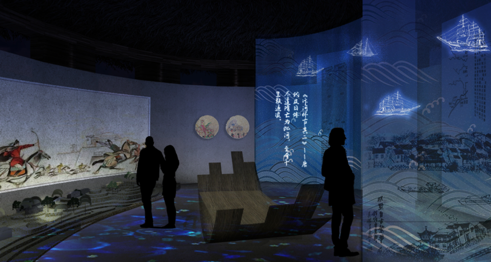 银奖作品《光运间——浚县粮仓改造(运河文明展陈设计)》选择具有历史意义的非遗土圆粮仓进行设计改造。展陈以运河文明为主题,将优秀传统文化精髓融入设计中,让具有重要文化价值和传承意义的非遗文明被大众熟知,进而增强文化自信和文化自觉意识。在不破坏粮仓本身结构和墙体的情况下,运用投影和纱幕,烘托展陈空间的运河氛围,让游客可以沉浸式地感受运河文明。