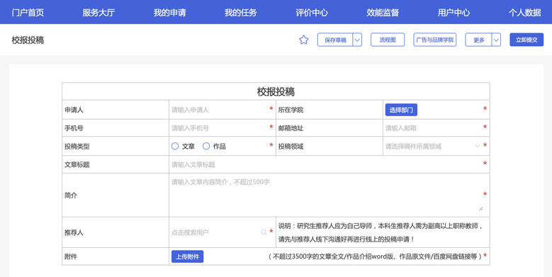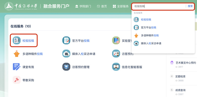 投稿方式:方式一:登录中国传媒大学融合服务门户(https://i.cuc.edu.cn/),搜索“校报投稿”,填写表单并提交。