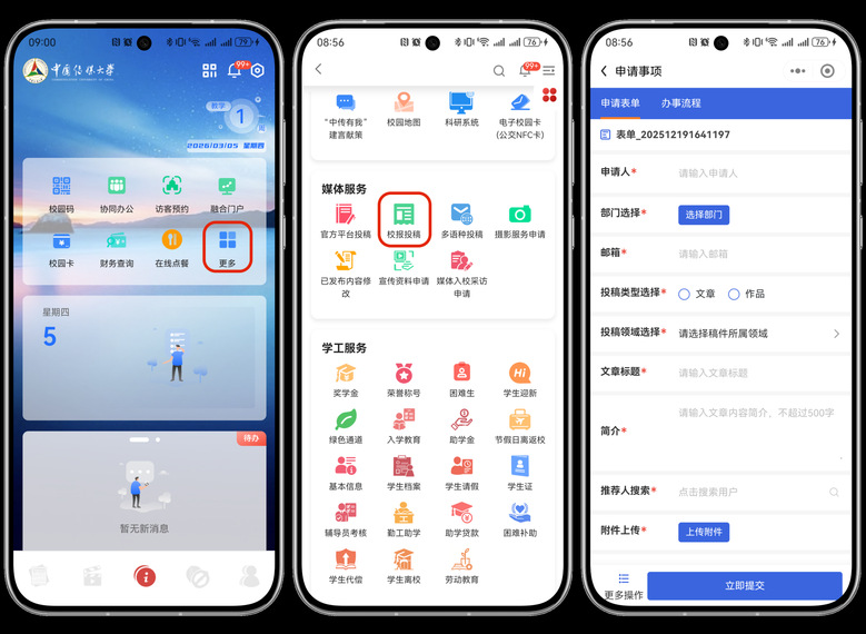 方式二:登录中传APP,点击“i中传”版块的“更多”,在“媒体服务”中点击“校报投稿”,填写表单并提交。